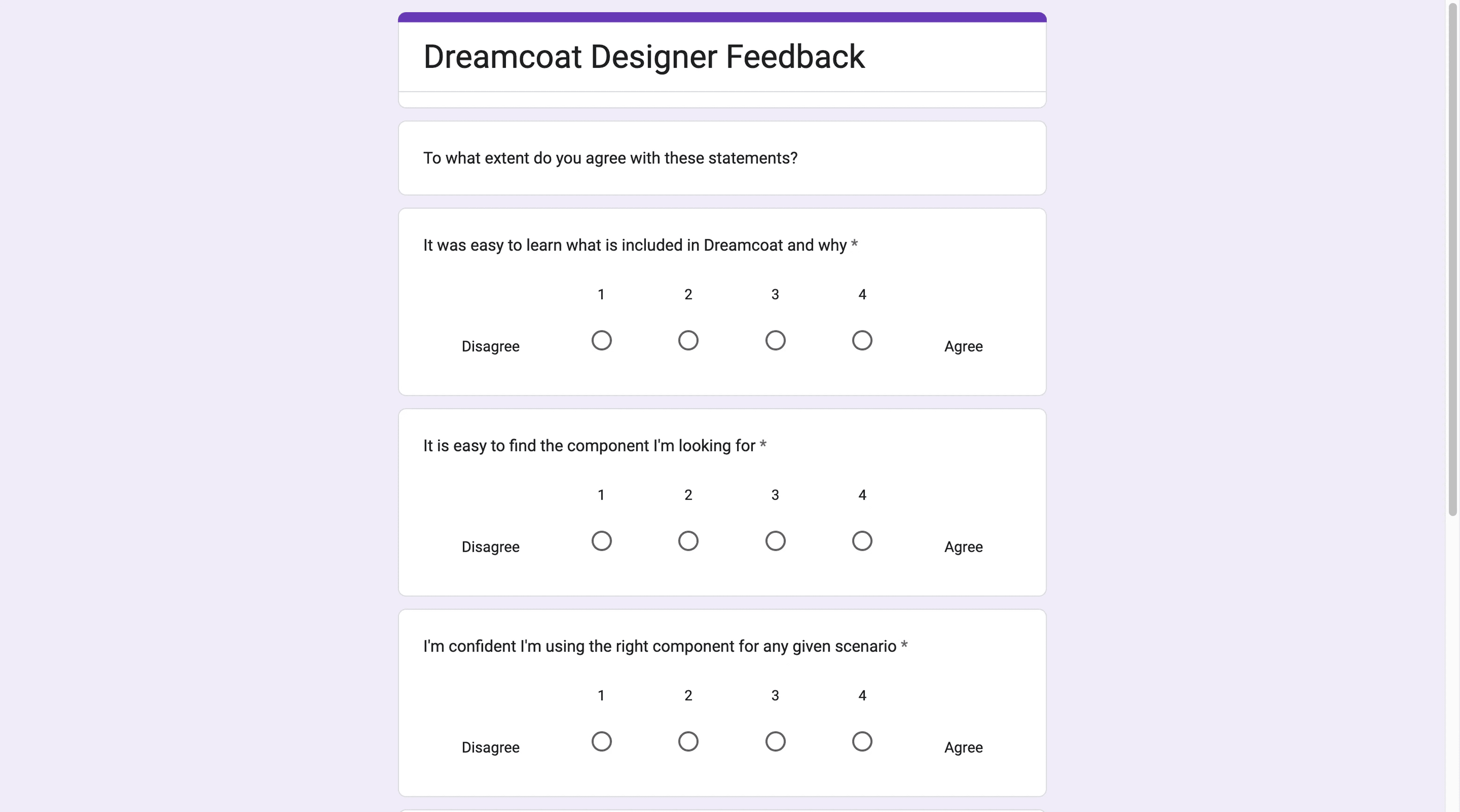 I designed a 4-point Likert survey to measure designer experience across five dimensions: learnability, discoverability, confidence, pattern implementation, and token application. Responses clustered around "2" (slightly disagree).
