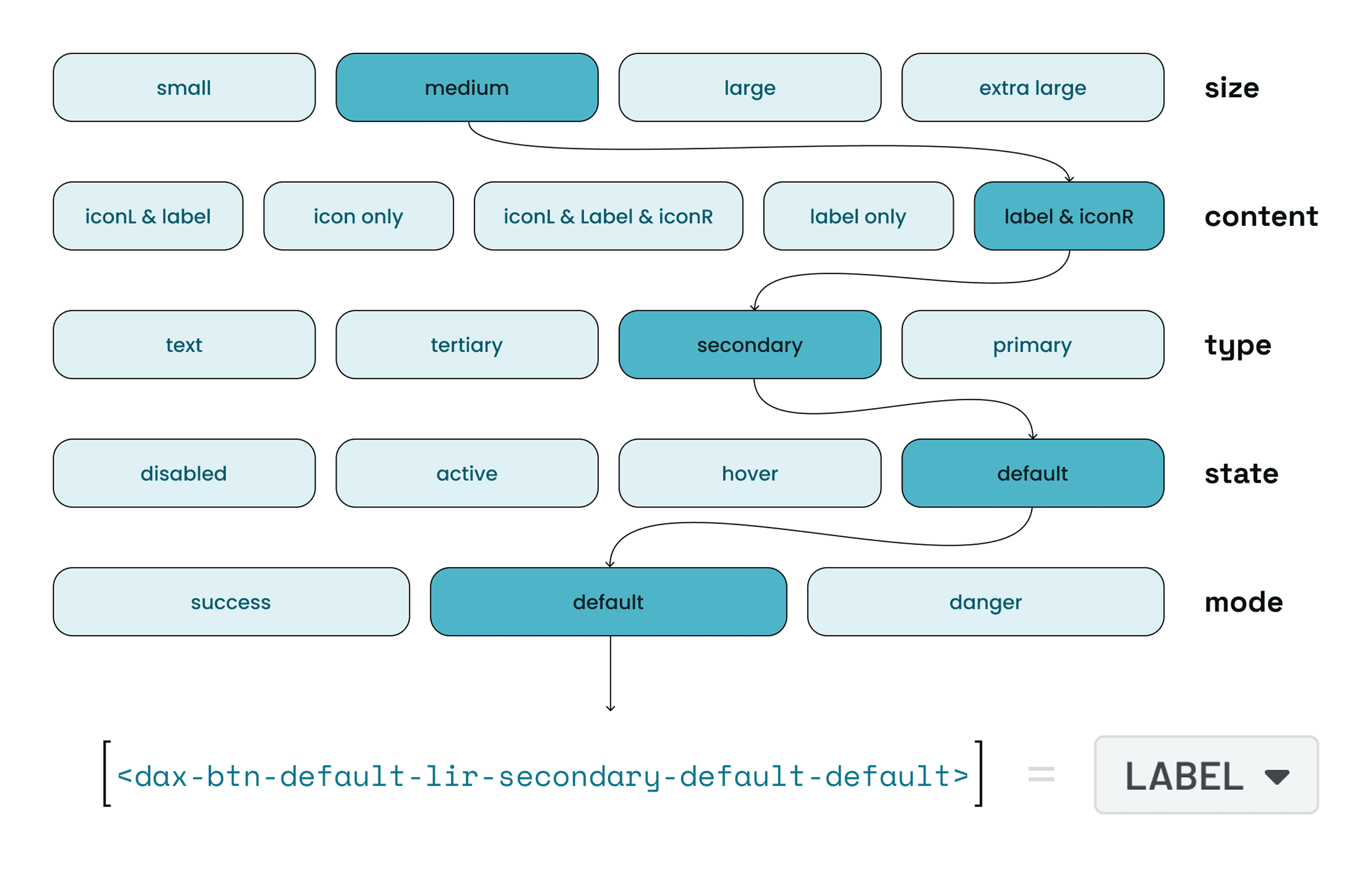 Orthogonal properties: Independent controls for size, content, type, state, and mode allow any valid combination without creating invalid states.