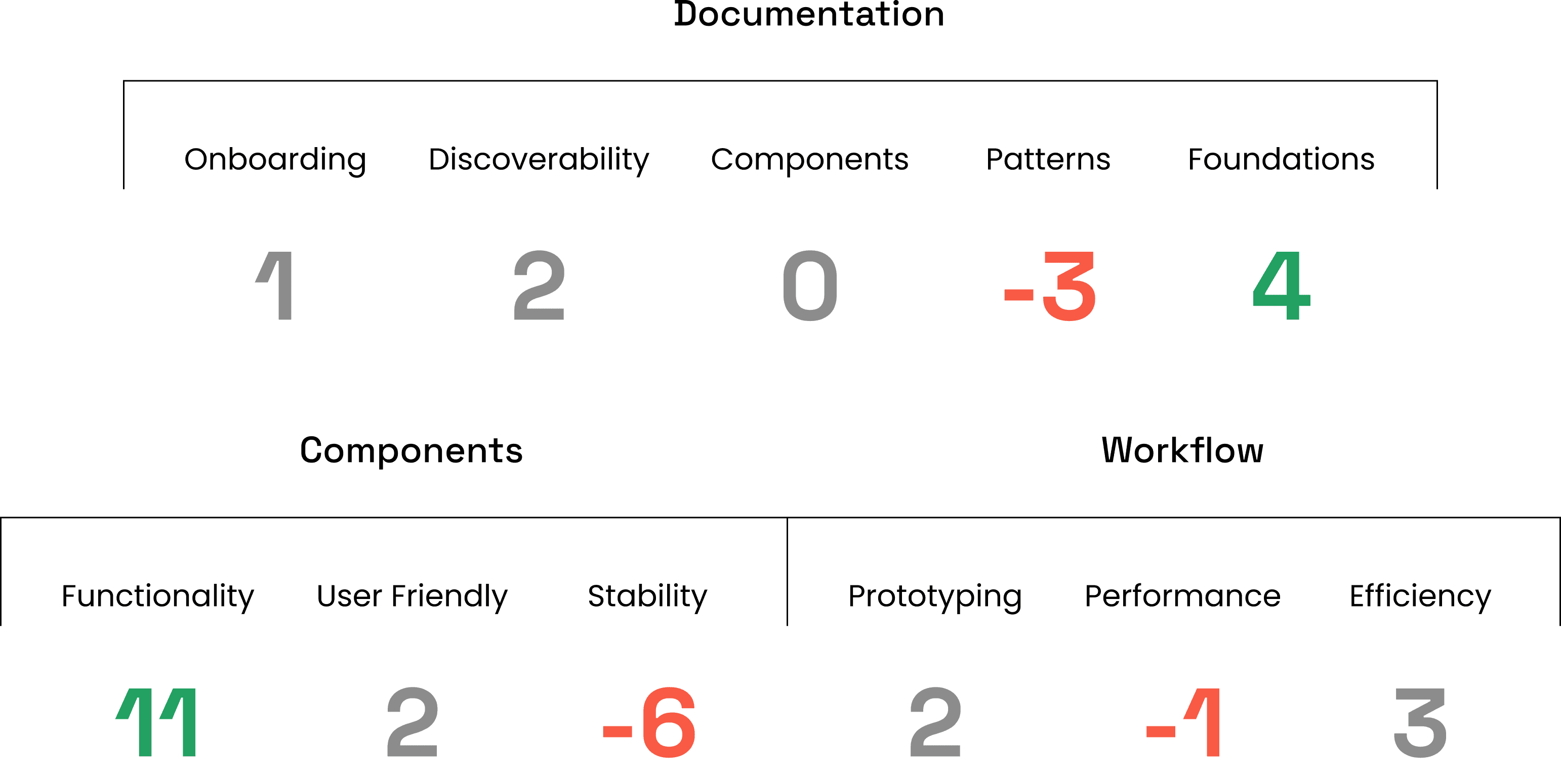 My documentation audit showed zero component-specific documentation, negative scores for pattern guidance, and only foundational token documentation at adequate levels.