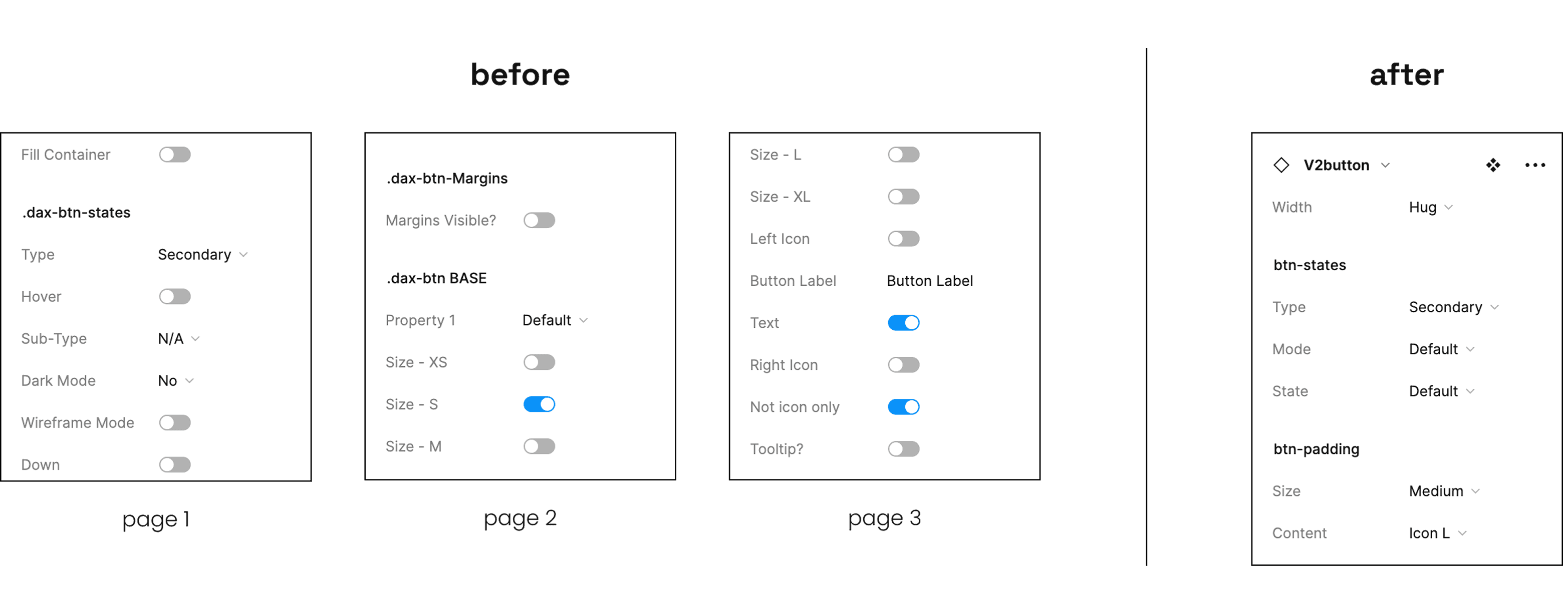 I mapped all existing functionality and rebuilt the component structure with a reorganized property architecture. Properties were grouped into logical categories (btn-states for visual styling, btn-padding for spatial properties) with semantic naming conventions that describe function rather than implementation.